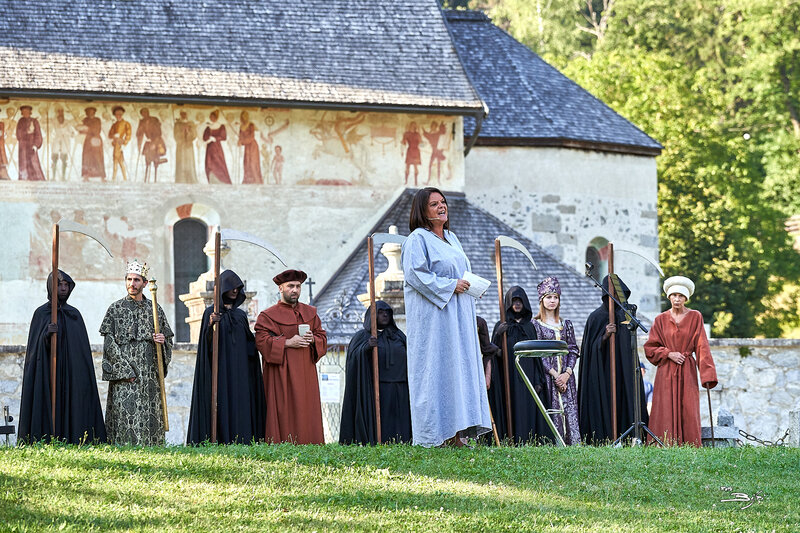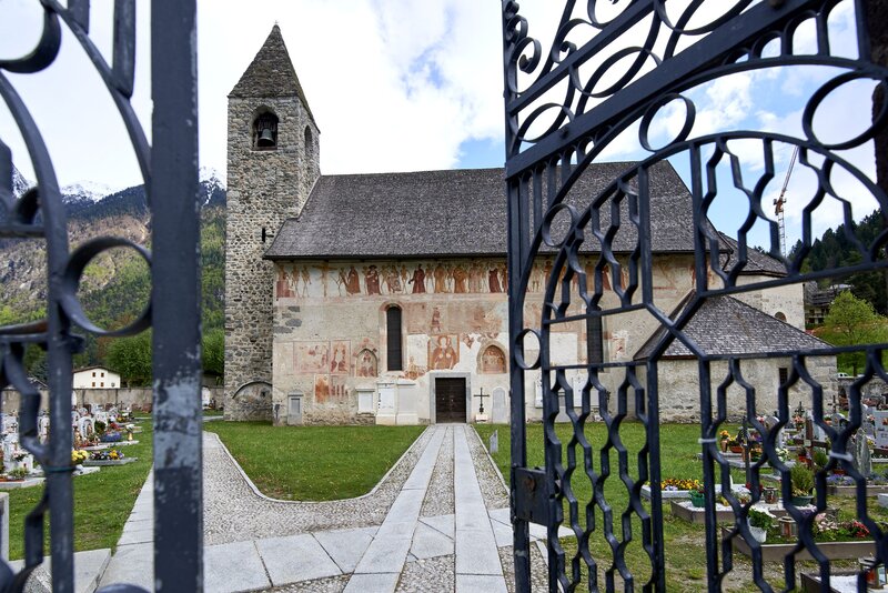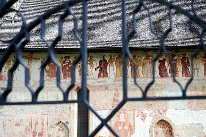 The architecture and frescosTraces of prior construction are still visible within the church, where slabs of granite in the floor indicate the ancient perimeter of the building prior to its expansion in the 16th century. In the same way, the border of the paint on the walls points to the “hut-like” form of the early architecture. The roof, which is made of trusses, finished externally in hand-cut larch-wood shingles and featuring broad pitches, has enabled the external frescoes on the south wall to resist both the elements and the passing of time. Although the wall has frescoes from the base on up to under the roof and the remnants of frescoes from prior to the 16th century remain visible, despite having faded or been partially covered, the series of works that dominates the space to this day, and which has made the church famous, is that of the Danse Macabre, the “Dance of Death”.
