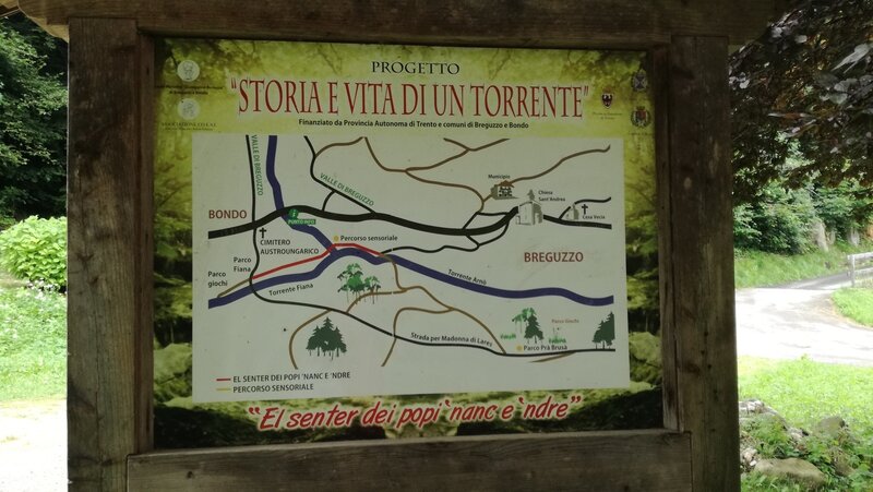 Dieser Weg verläuft entlang zweier Bäche, des Fiana und des Arnò, und erlaubt es, in die prachtvolle Umgebung einzutauchen, die sie umgibt. Zwischen Ausblicken auf die Schlucht, einer Hängebrücke, verschiedenen Picknickzonen und einem Steg zwischen Felsen und Flussbett verbindet dieser Weg die beiden Dörfer Bondo und Breguzzo. Die Kleinsten können so in eine Umgebung eintauchen, in der das Wasser die wahre Hauptrolle spielt, während sie die verschiedenen Holzskulpturen entlang des Weges entdecken. Vom Spielplatz in der Ortschaft Fiana aus folgt man dem Wasserlauf entlang des Pfades, der treffend „El senter dei popi e'nanc e'endre“ („Der Weg der Kinder vorwärts und rückwärts“) genannt wird, bis man Breguzzo erreicht, wo sich ein weiterer Spielplatz neben einem Sinnespfad befindet, der das buchstäbliche Eintauchen in einen kleinen Bach in wechselnden Empfindungen ermöglicht: glatt-rau-weich-nass-kalt.