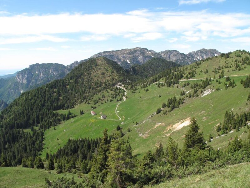 Vom Parkplatz aus in Richtung Westen auf der Straße weitergehen, die sich über die Hänge des Monte Lavino schlängelt, die steil in Richtung Valle Pra di Lavino hinab gehen.