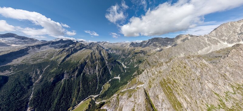 Schon bald erreicht der Pfad die strategisch bedeutenden Ganöta-Posten. Von hier eröffnet sich ein weites Panorama, in dem Geologie und Geschichte untrennbar miteinander verschmelzen. Weite Teile der Adamello-Gruppe liegen zu Füßen, der Blick fällt in das tief eingeschnittene Val Genova Tal mit seinen Seitentälern – Germenega, Siniciaga, Làres, Folgorida und Stablel. Hoch darüber thront, einem schlafenden Riesen gleich, der Vedretta di Làres Gletscher, während im Hintergrund der mächtige Carè Alto, der legendäre Corno di Cavento und der schroffe Crozzon di Làres dominieren. Im Norden umrahmt das obere Val di Nardìs Tal den majestätischen Gipfel der Cima Presanella. Zu Kriegszeiten verband dieser Weg entlang des Tamalè-Kamms die Posten und Artilleriestellungen am Gebirgskamm – teils über Stege und seilgesicherte Passagen – bis zur Seilbahnstation am Passo Scarazzon delle Rocchette Bergpass.