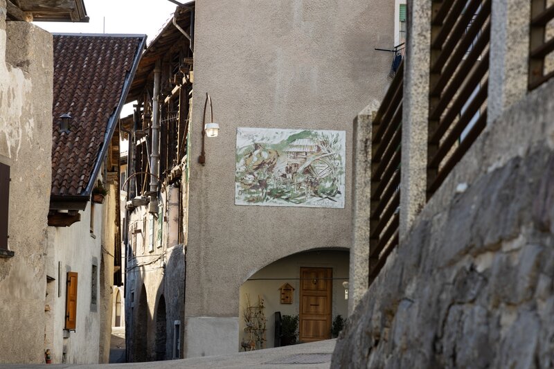 Dieser Pfad verläuft entlang des Randes der Wiesen von Ragoli oben, entdeckt Felder wieder, die einst mit Weinreben bepflanzt waren, und erreicht schließlich den künstlichen See von Ponte Pià.
