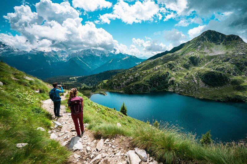 Route, die zunächst zur Malga Ritort führt, einer außergewöhnlichen Panoramaterrasse auf die Brenta-Dolomiten, und anschließend zu den kristallklaren Gewässern des gleichnamigen Sees weitergeht.