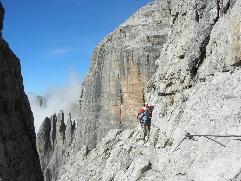Alpiner Klettersteig, panoramareich und ausgesetzte Abschnitte in der Nähe der Cima Tosa. Der Klettersteig wurde 1950 eröffnet und verbindet die Rifugi Pedrotti und Agostini entlang eines eindrucksvollen Bands, das stellenweise sehr schmal und ausgesetzt ist, unterhalb der Cima Garbari, bevor er mit Leitern, Stufen und Drahtseilen an einer etwa hundert Meter hohen senkrechten Wand absteigt.