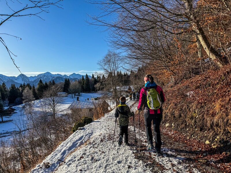Der Weg ist hauptsächlich eben mit kurzen Anstiegen und verläuft im ersten Teil auf einem Pfad durch den Wald bis zu Malga Lodranega, während der Rückweg von Malga Lodranega zur Ortschaft Le Sole über eine verschneite und gespurt Forststraße führt.
