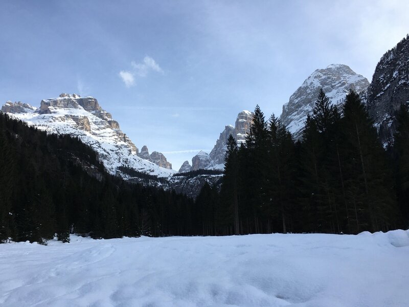 Wanderung überwiegend flach, mit abwechselnden Abschnitten auf verschneitem Pfad und Forststraße. Sie führt hauptsächlich durch einen Wald mit wunderschönen Weißtannen, der manchmal von offenen Flächen, Wiesen, Almen und Lichtungen unterbrochen wird. Die Route verläuft entlang klarer Wasserläufe, durchquert das Val Brenta und führt bis zur malerischen Lichtung bei der Malga Brenta Bassa. Dort eröffnet sich ein atemberaubender Blick auf die Dolomiten und den Crozzon di Brenta, der mit seiner Westwand das Tal dominiert.