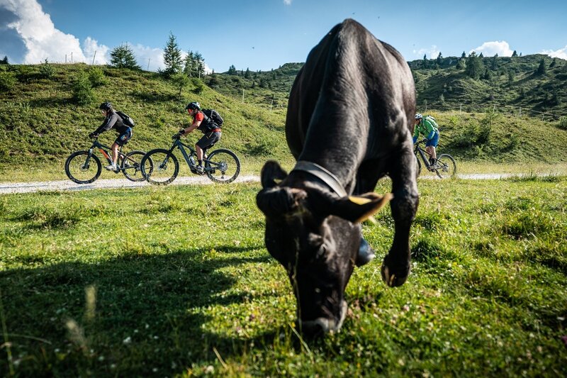 Sehr panoramareiche und anspruchsvolle Strecke, die vom Monte Spinale über Schotterwege und Waldpfade die verstreuten Almhütten rund um den Passo Campo Carlo Magno besucht.