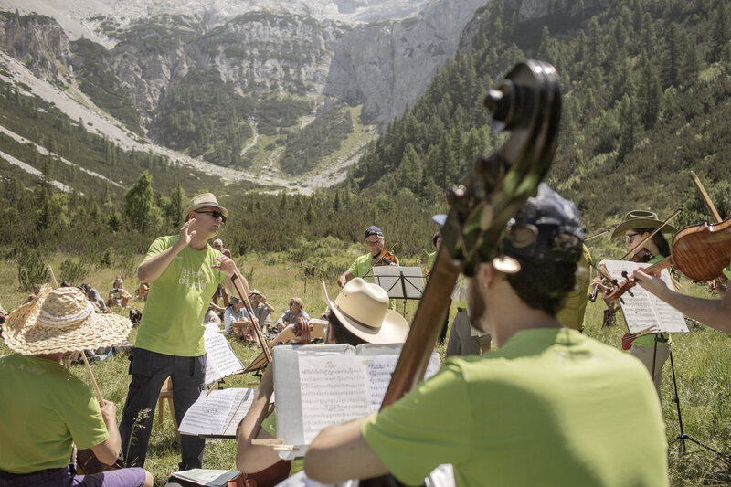 come together on the natural stage of the Dolomites. Join the musicians and climb the paths to the alpine meadows, clearings, hollows and peaks. Up there, where music intertwines with the landscape, plays with the echoes, and flies away on the flurries of the wind.