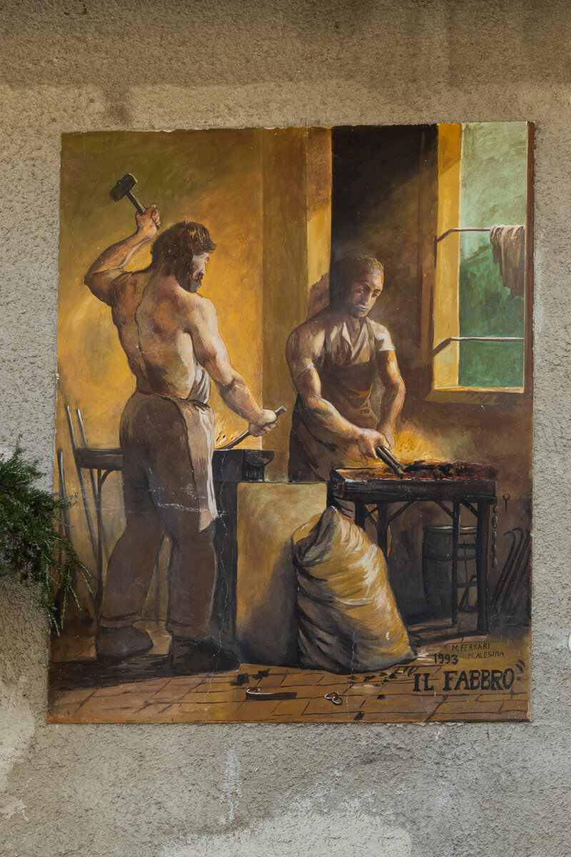 On the facades of the houses, graffiti and frescoes by artists from the Brera Academy of Fine Arts (Milan), between 1993 and 1994, evoke the history and activities of the past: the work of blacksmiths in the forges, the extraction of black marble from Ragoli, peasant life, washerwomen at the fountains, hemp processing and the history of the silkworm. Of particular historical importance is the graffito of the meeting of heads of families at the foot of the old "Campanil" of the Rules, created on the facade of the building of the Comunità delle Regole di Spinale e Manez.