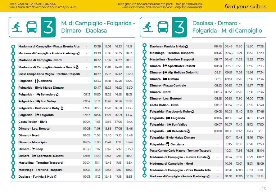 The ski bus Val di Sole is available every day from 30 November 2025 to 11 April 2026 and connects the Sole Valley with Madonna di Campiglio Ski lifts and the town centre.