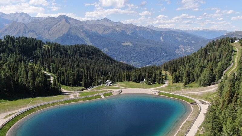 Lungo il percorso siono state installate 4 strutture in legno in punti esteremamente panoramici; l’insieme dei 4 elementi dà forma ad un battipista posto sulla sponda del lago, nei pressi della piccola spiaggia di ghiaia.