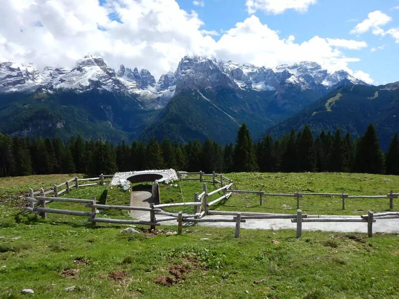 Comodissima passeggiata su strada asfaltata che conduce da Patascoss a Malga Ritort, straordinaria terrazza panoramica sulle Dolomiti di Brenta.