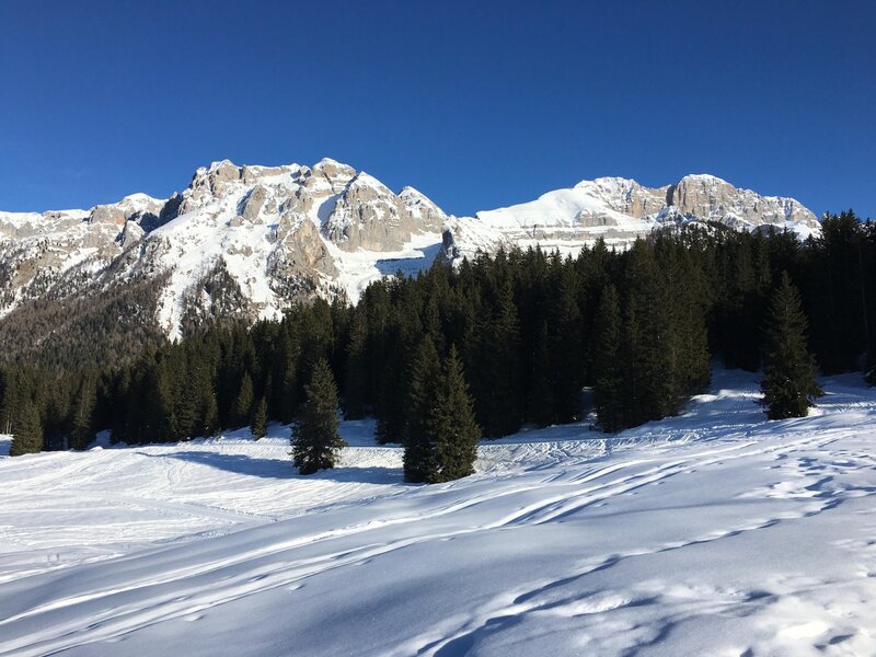 Gradevole passeggiata invernale adatta alle famiglie percorribile a piedi o con racchette da neve. L'itinerario costeggia le piste da fondo di Campo Carlo Magno sino alla Malga Mondifrà.