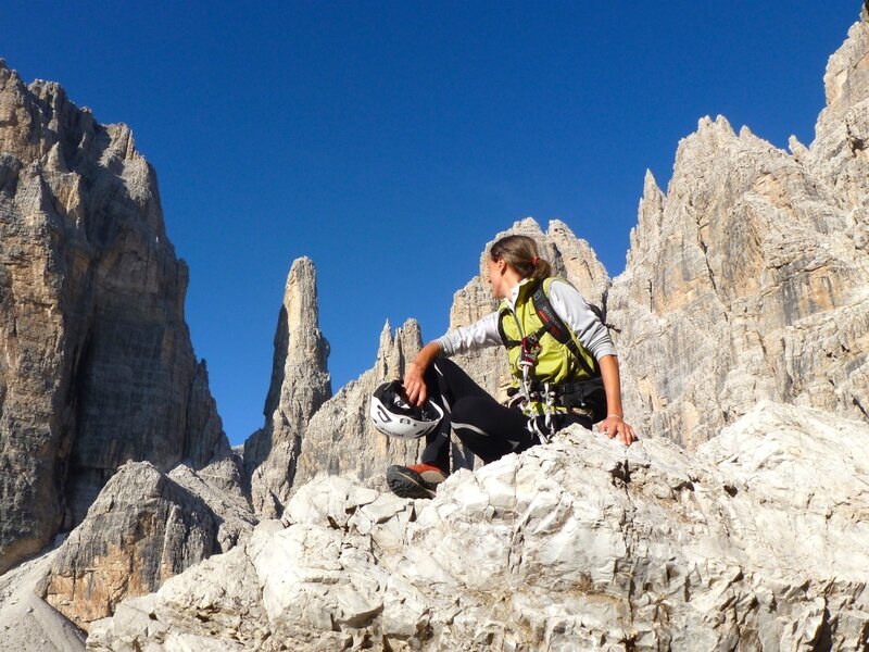 Via ferrata poco frequentata, molto impegnativa, lungo scale esposte e strapiombanti sotto Cima degli Armi. Rapido rientro per i Rif. Pedrotti e Alimonta arrivando dalle Bocchette Centrali.